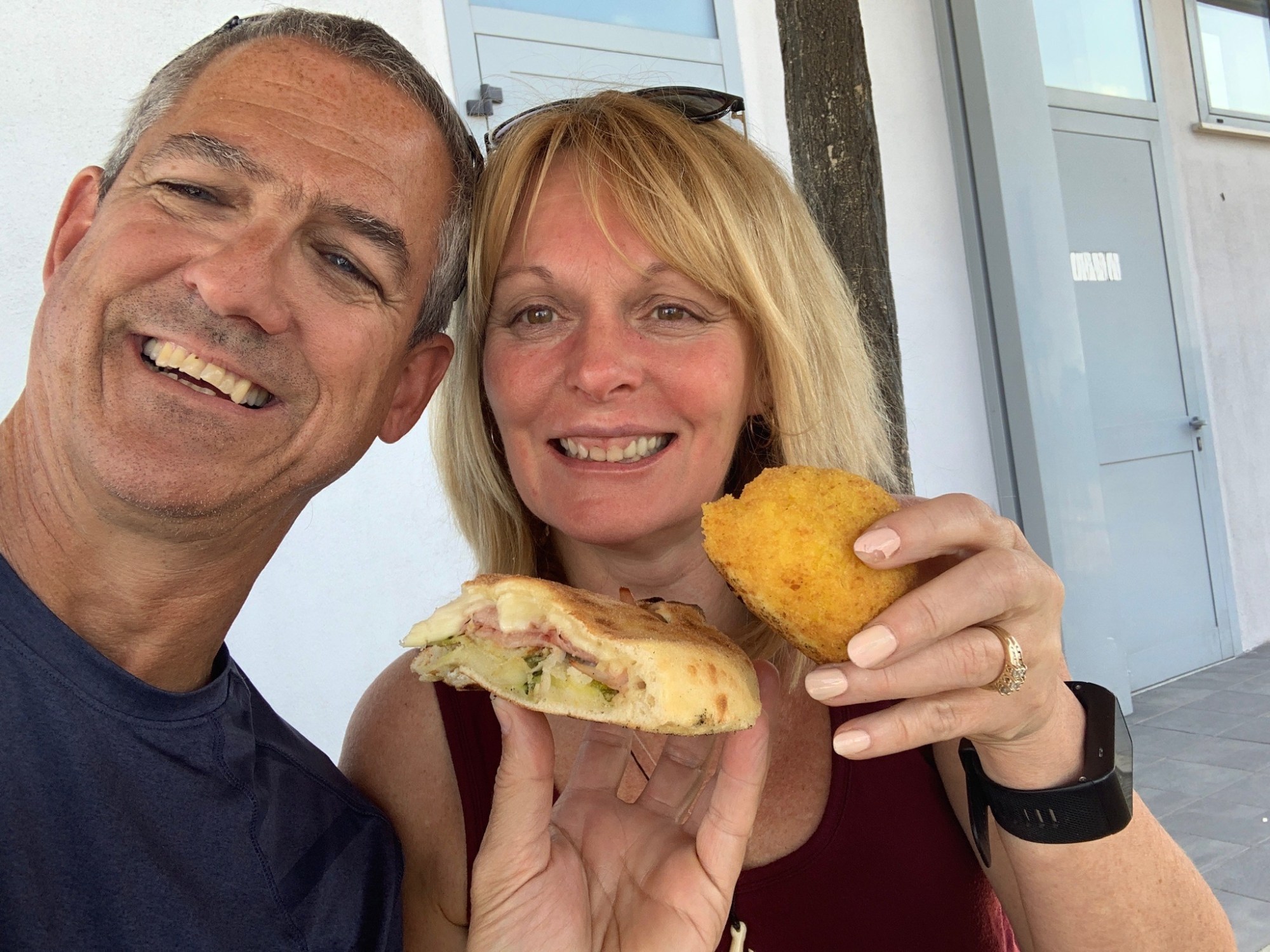 Most of the trip was on a toll highway which took up by many olive groves and grape orchards. A little hunger and needing a stretch we stopped at a restaurant on the side of the rode for pizza. We ended up with a Rustic (like a calzone) and an arancini for our lunch.