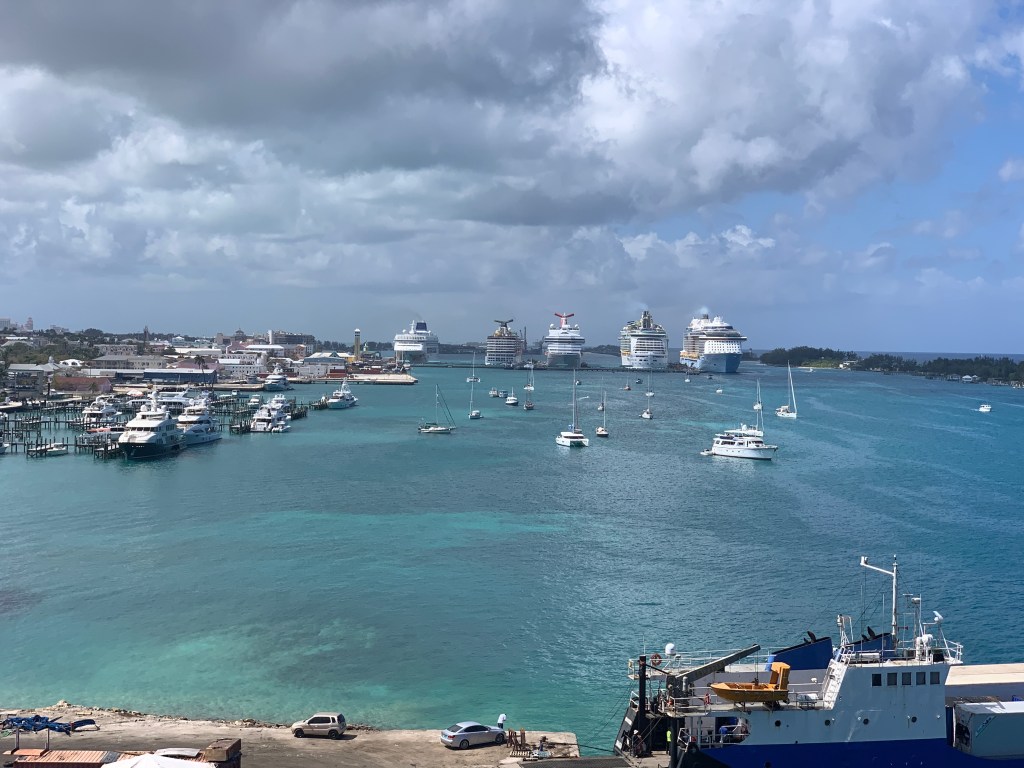 From here we crossed a large bridge to get to Paradise Island where we spent the afternoon on the beach enjoying the surf, sand and sun. There were lots of cruise ships at Nassau today – five!
