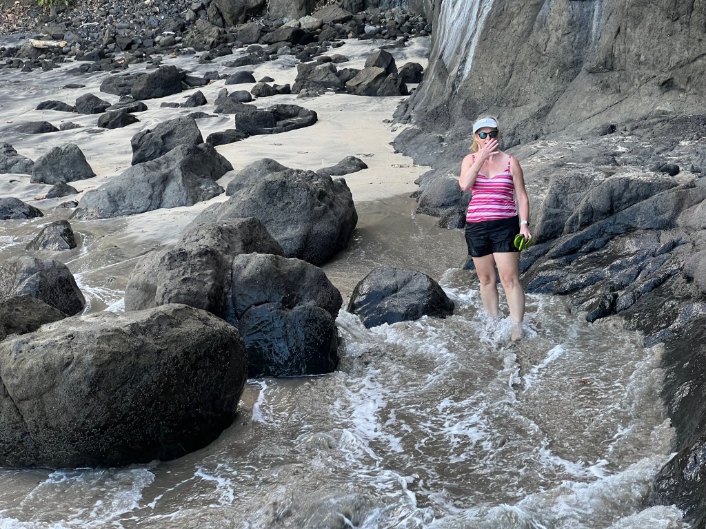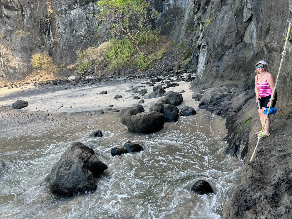 Our day began today with a walk along the rocky shore of Playa Hermosa to see if we could find any isolated beaches or other interesting trails. Once around the peninsula we discovered a cute little bay which was only accessible by traversing a steep rock face. With a rope as encouragement, I attempted the climb down. Incurring a little damage – small scrape on my elbow and shoulder – I made it to the beach. The ascent up the rock face however posed a little more of a challenge as the waves crashed at my feet.