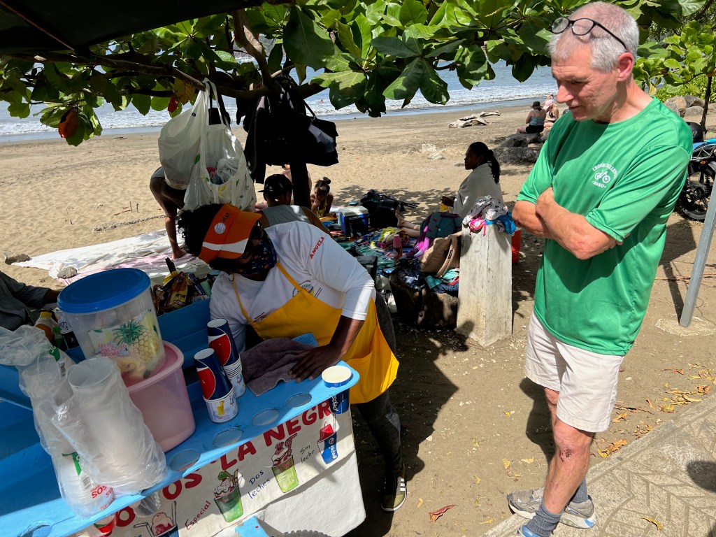 Today locals were decorating the park for Christmas, many street vendors selling the classic pinchos – a shish-kabob of savoury meat on a stick – as well as ice cones and lots of people playing in the water. We walked the boardwalk, tried a pinchos and an ice cone and then had a drink at one of the beachfront bars. On our way home we found a different bike shop, checked out the electric bikes and booked for a tour on Wednesday morning.