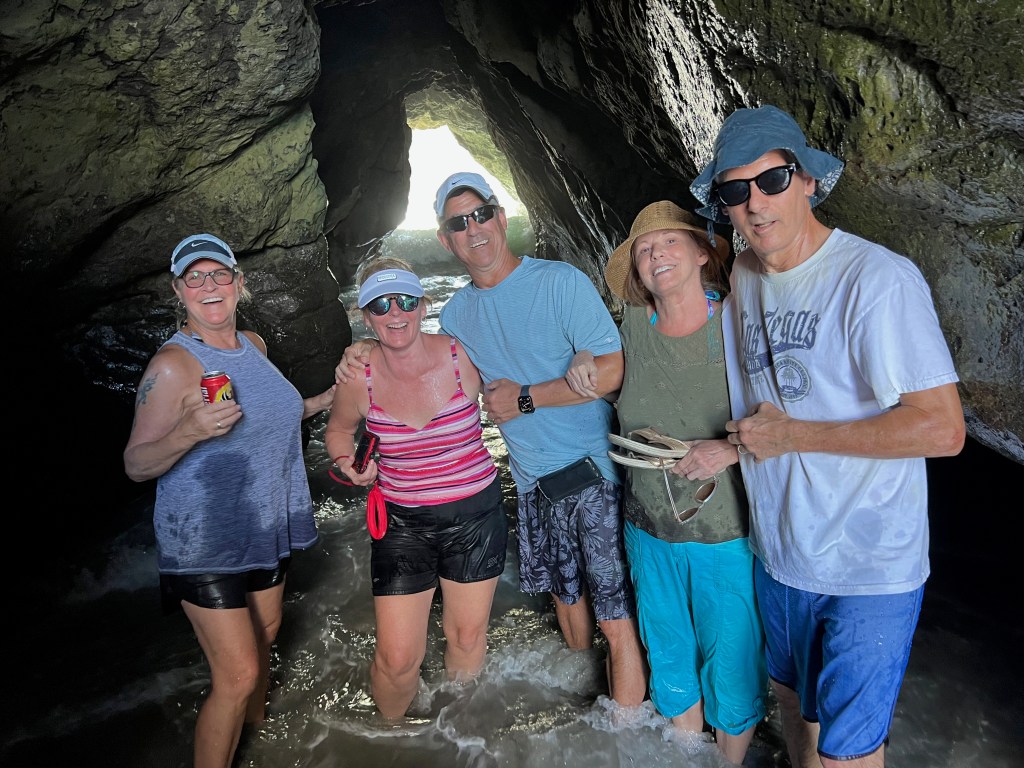 Our first stop was a small beach to investigate a cave that we could walk through at low tide. In the cave the waves crashed through and we decided to only go half way and get a photo. While waiting for the photo to be taken I lost both of my flip flops. Moika said “no problem we will just wait for them to come back to us”. No sooner were we out of the cave and both of my flip flops came floating back out.