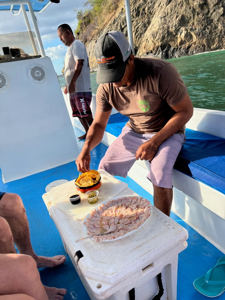 Back on the boat, Moika treated us with a Costa Rican appetizer known as carpaccio. He made it with fresh mahi mahi that he had caught on Monday. The dish was served with soya sauce, jalapeños and tortilla chips. It was delicious!