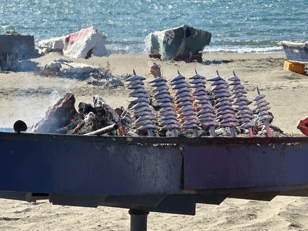 The boardwalk was bustling with people and was bordered by small cafes on one side and beach on the other. Every so often, on the beachside, we would come across an old boat lifted on a pedestal with a fire burning in it and small sardines cooking on wire spikes.
