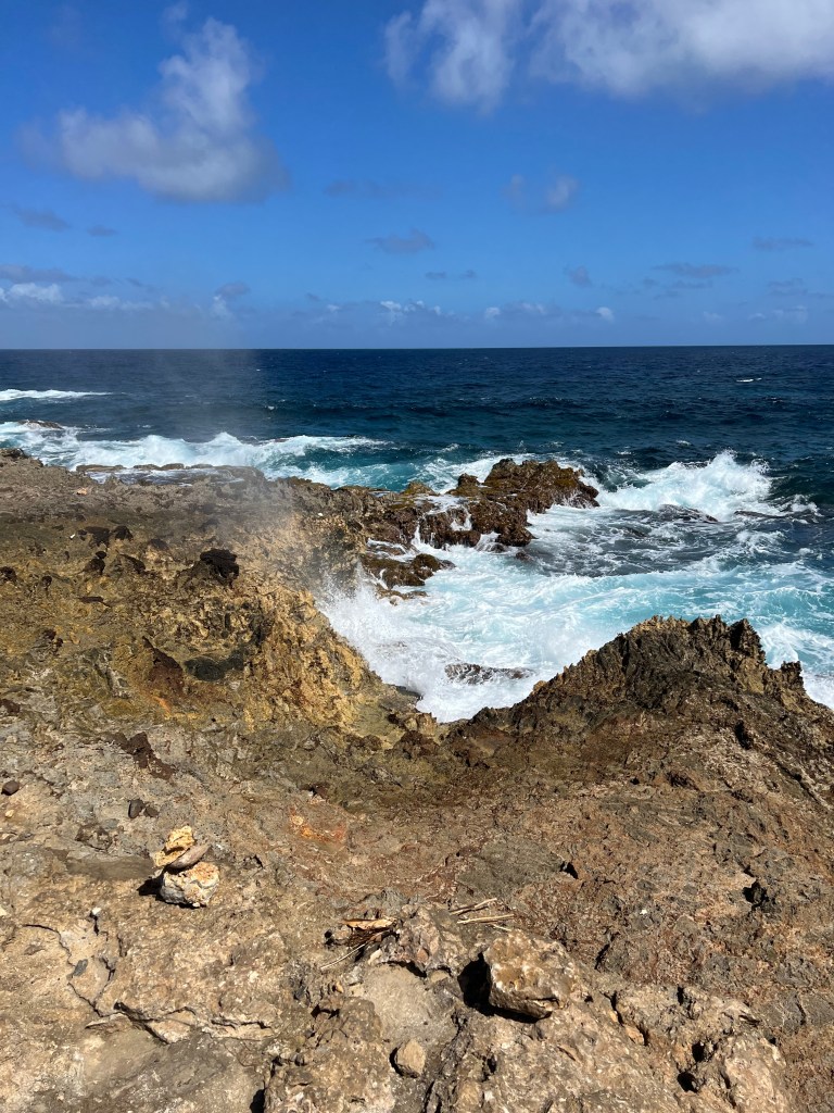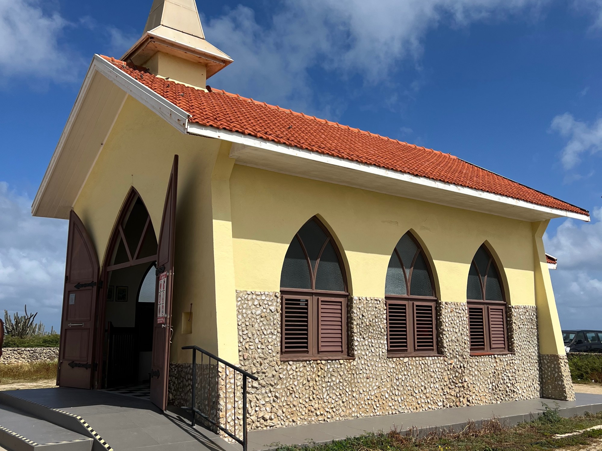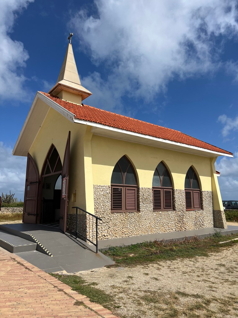 Our exploring started on Wednesday with the Alto Vista Chapel. The Alto Vista Chapel is a small Catholic chapel also known as “Pilgrims Church” and stands on the hills above the north shore of the sea and to the northeast of the town of Noord. The church, painted on the outside in stark bright yellow, makes it a conspicuous religious monument for people to visit. The present Chapel of Alto Vista was completed in 1952 and stands in the same location as the original chapel, which was built by Domingo Silvestre, the Venezuelan missionary in 1750. It is said to be the location where the conversion of the Aruban Indians to christianity started.