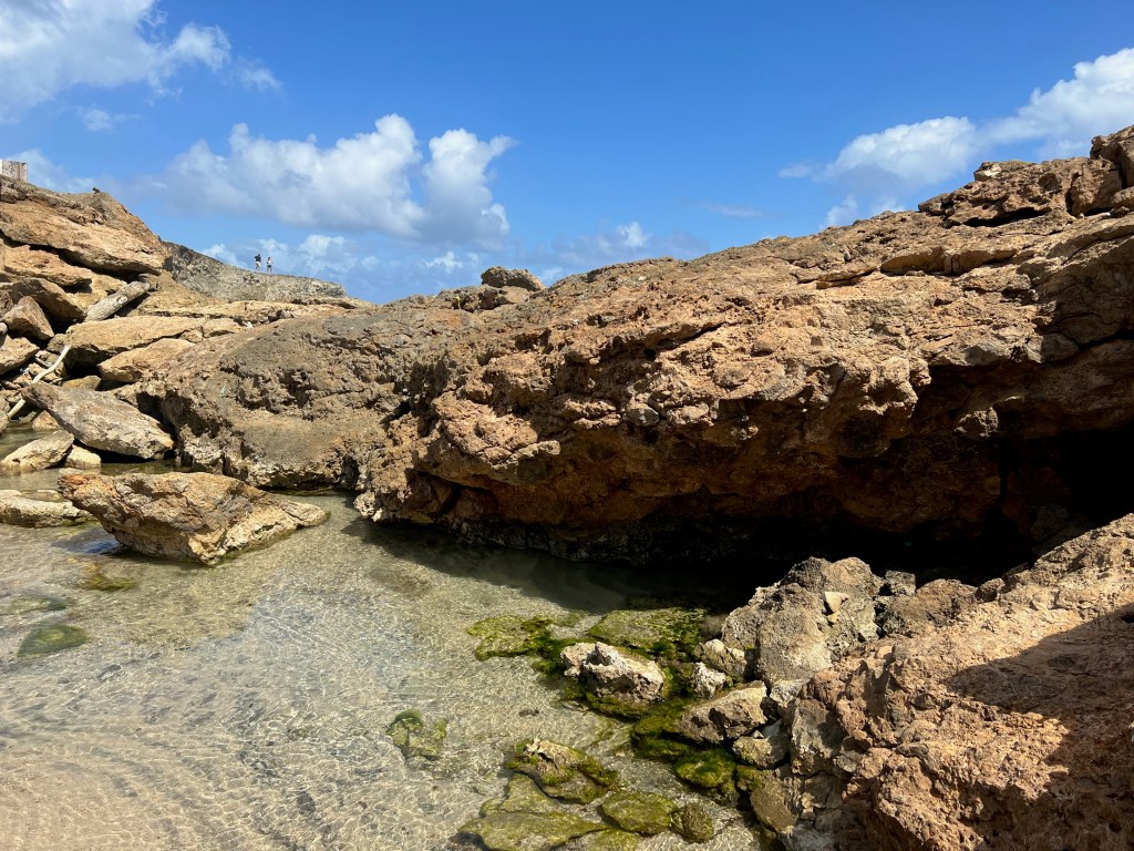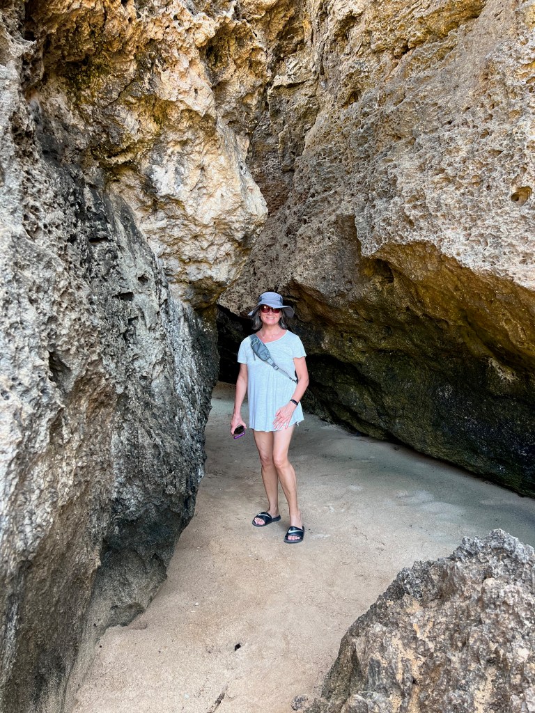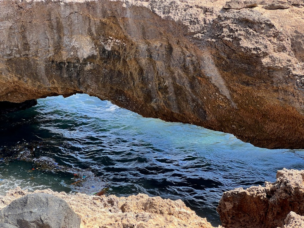 From the ruins we drove a little further up the coast to the Natural Bridge. The Natural Bridge was formed by waves crashing against the limestone cliffs and is no more as the archway collapsed in 2005. However, there was a baby bridge beside it and the area around the Natural Bridge was beautiful with many rock formations that we could walk through.