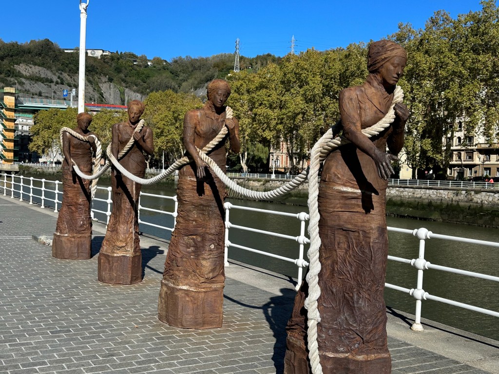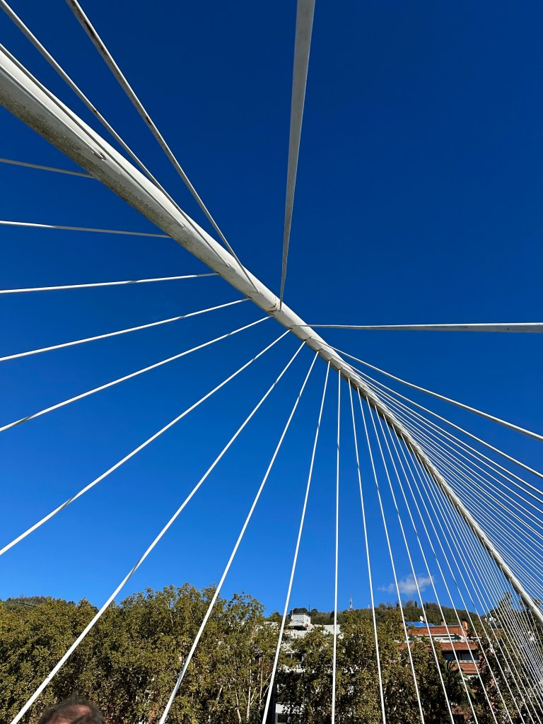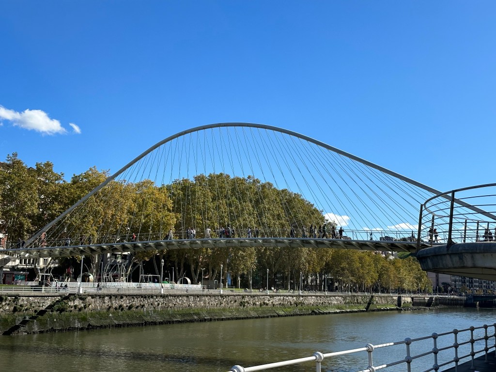 From here we strolled along the Nervion River and crossed over it using the Zubizuri bridge, also known as the Calatrava Bridge after the architect who built it. The bridge is an arched structure, white and slender, resembling a sailboat ten metres above the river. Its glass surface has generated much controversy, so today what you walk on is a non-slip mat.