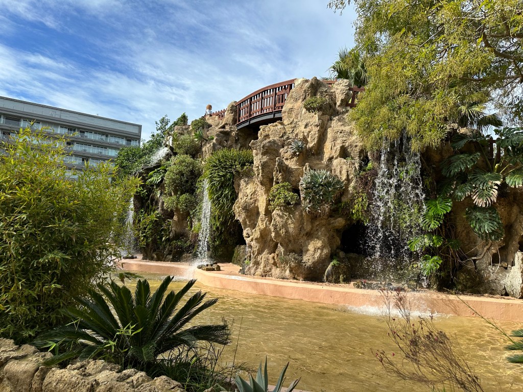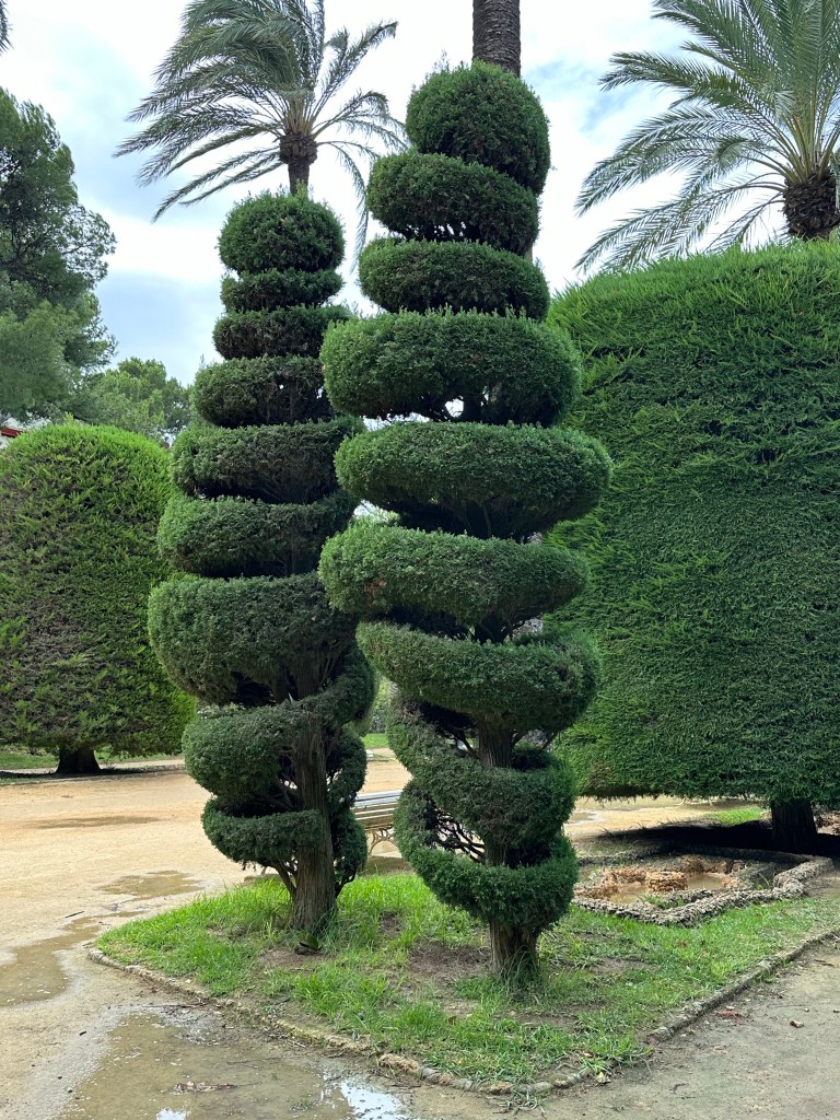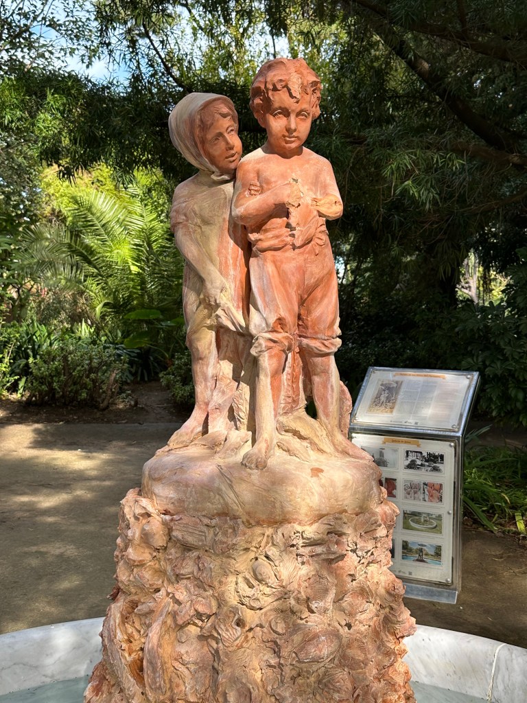 As we made our way through the main entrance of Parque Genovés we were presented with a central walkway flanked by common cypresses and California cypresses trees, pruned into rounded shapes typical of an English-style topiary. Within the park was a pond with a large waterfall and grotto as well as the famous “Children under the Umbrella” fountain sculpture depicting the children from the story written by Jacques-Henri Bernardin de Saint-Pierre and published in 1787.