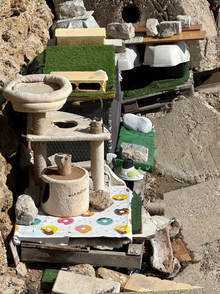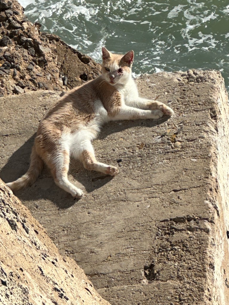 As we walked along the promenade we noticed these make shift houses between the city wall and the ocean. Our first thought was perhaps homeless individuals lived here and then quickly realized it was cats.