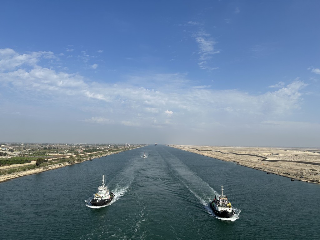 We arrived at the entrance to the canal – Port Said – the night before our transit and anchored in the Mediterranean Sea with many other boats that would form our convoy through the canal the following morning. Each day there is one northbound and one southbound convoy through the canal. As we were a passenger ship we would be one of the lead ships in the convoy. Boats are ordered and are allowed to enter every 10 minutes between 0330h and 0800h and must travel at a speed of 14 km/h through the canal. A pilot is required to board all ships and remains on the ship for the duration of the transit. Our ship was also escorted through the canal by 3 tug boats. I was told, though I am not sure if it was accurate information or not, that we had so many escort boats because of the unrest in the Gaza Strip and Israel. The tug boats followed us closely during the entire transit.