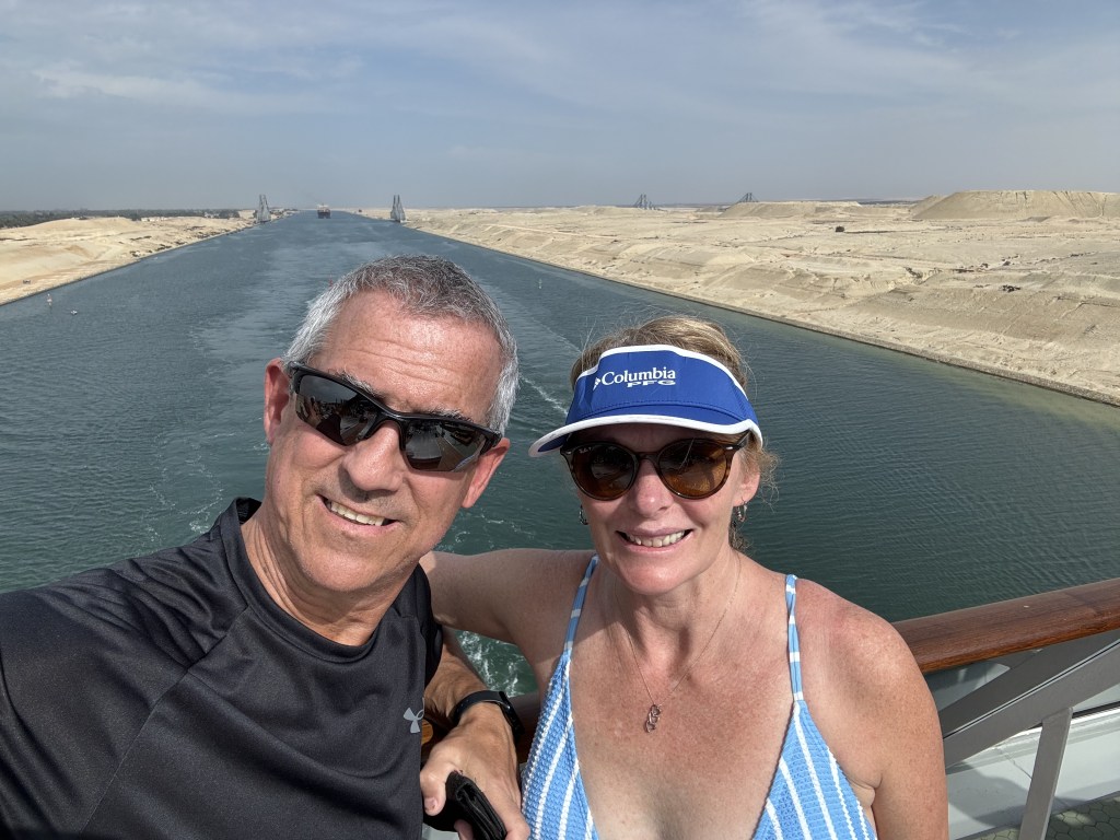The transit was very interesting. From our balcony we could see both sides of the canal (Egypt and Asia). Both sides were desert for as far as you could see with the Egypt side having some residential areas along the route. It surprised me that there were many small, manually manuevered, vessels fishing in the canal. At one point we were able to see a sand storm in the distance but luckily it did not come close to the canal.