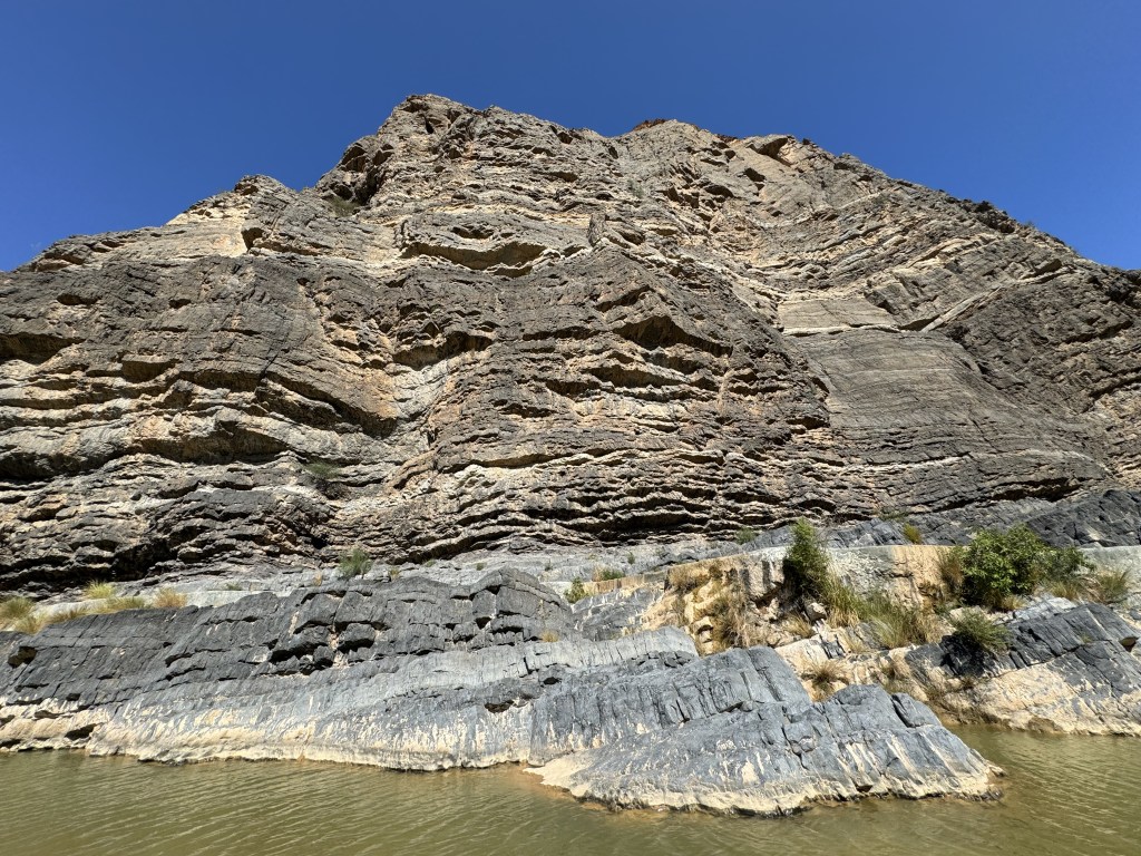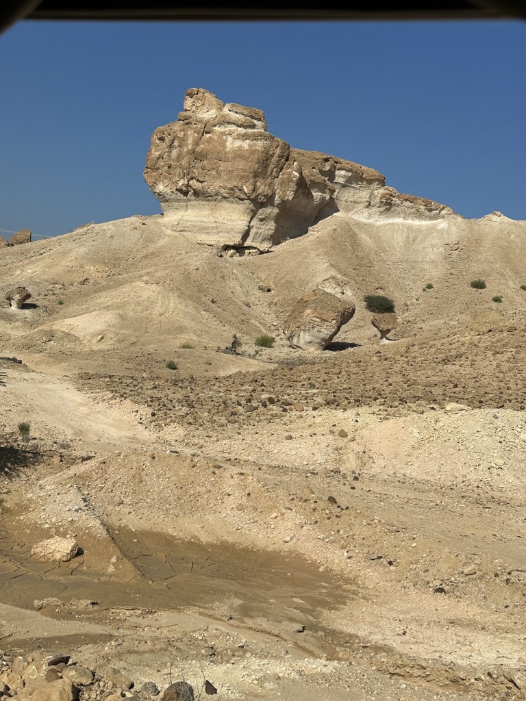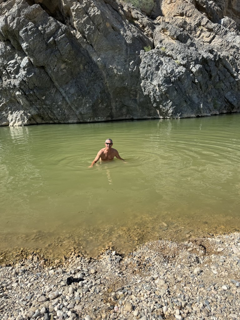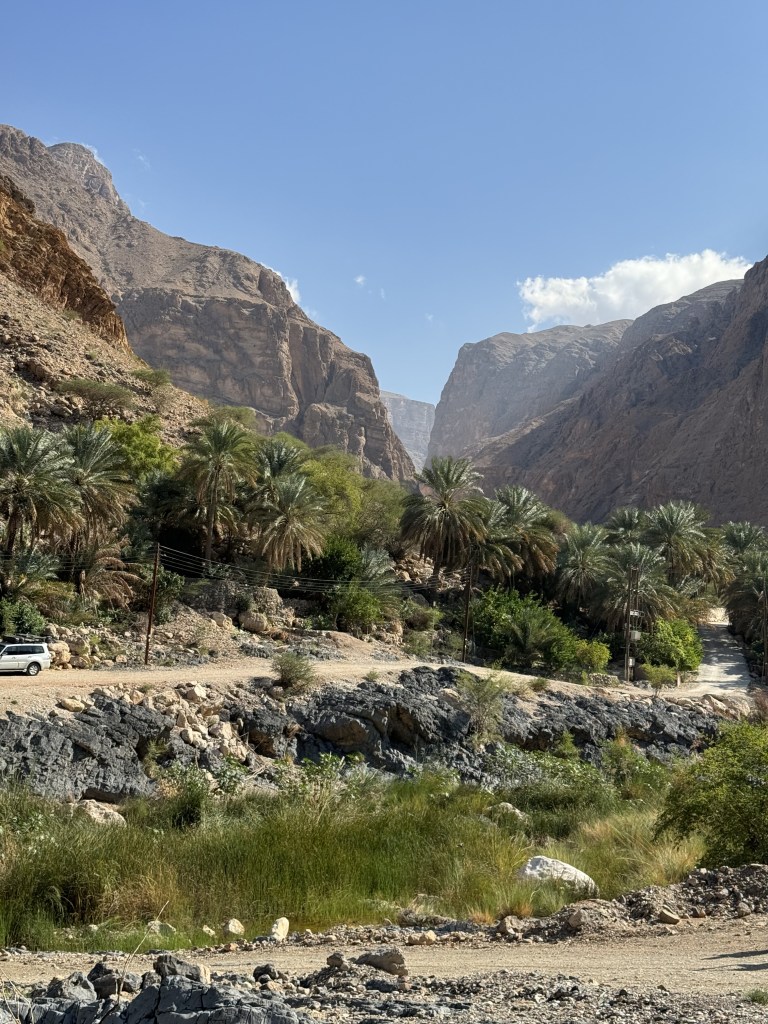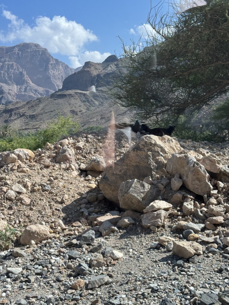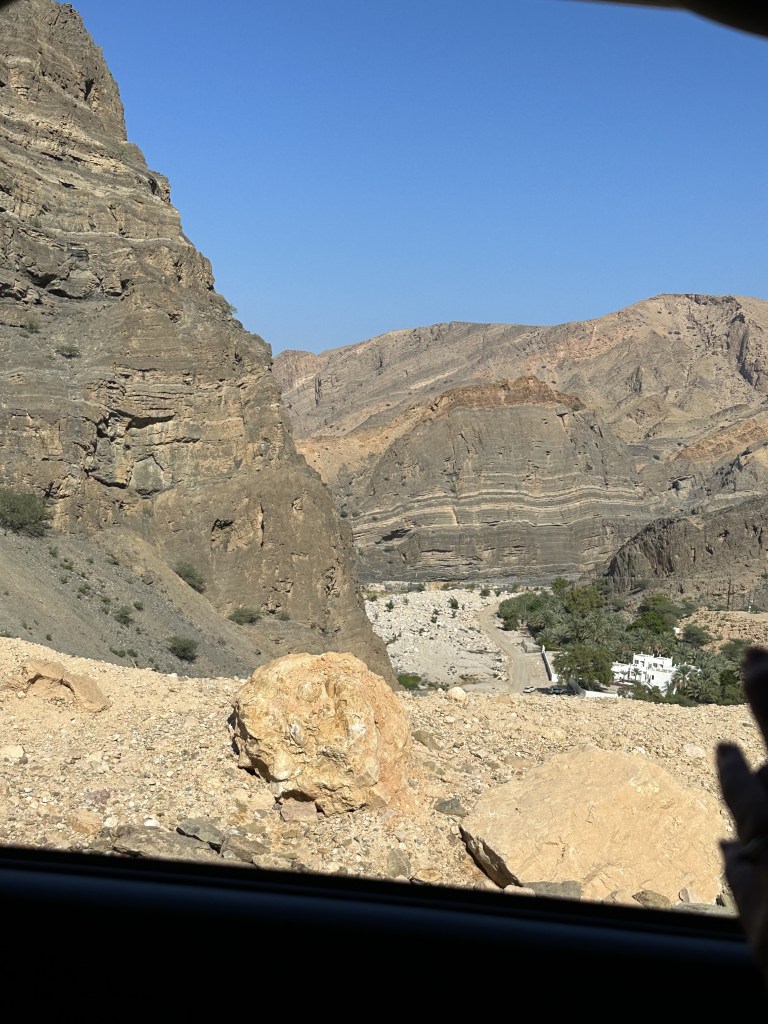 From here we started our bumpy off-road drive along the coast and then up through the mountains. As we started on the dirt road our driver spotted some camel and stopped so we could take a picture of them. Our next stop would be at Wadi Al Arbaeen. A wadi is a dried river bed in the valley of the mountains. Wadi Al Arbaeen is declared one of the most beautiful wadis in the Sultanate, experiencing a constant flow of spring water from the eastern Hajar Mountains and providing a source of irrigation to the surrounding villages and date palm farms. We were able to swim here. The water was not as crystal blue as shown in the photos but murkier with little fish that like to clean the skin on your feet.