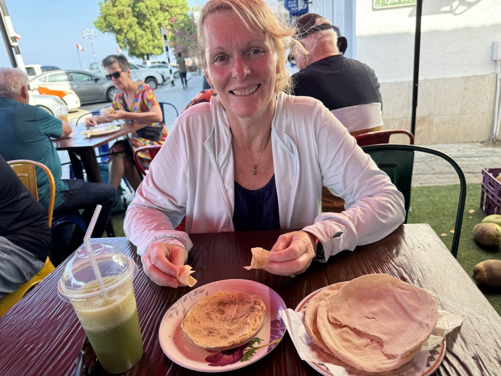 On our way back we ventured into the Mutrah Souk. This is a fascinating maze of fragrant alleyways where you see antique treasures, precious gems, souvenirs and rare Asian spices around every corner. Every store owner trying to get your attention and entice you into their store. We then stopped for a drink and a snack of hummus and pita.
