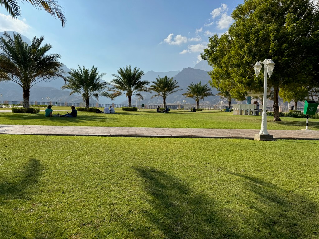 Our first day was spent exploring the port area of Mutrah. We strolled along the Mutrah Corniche which stretches for 3 kilometres along the waterfront and is lined with international restaurants, traditional cafes and markets. We walked past the Mutrah Fort built in the late 16th century by occupying Portuguese forces and on through some beautiful parks. In one park beside the sea we were fortunate enough to see two beautiful sea turtles playing in the water but not quick enough to catch a photo of them.