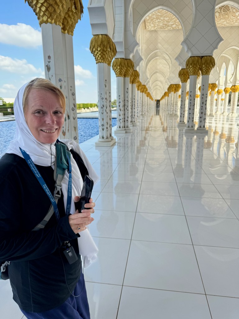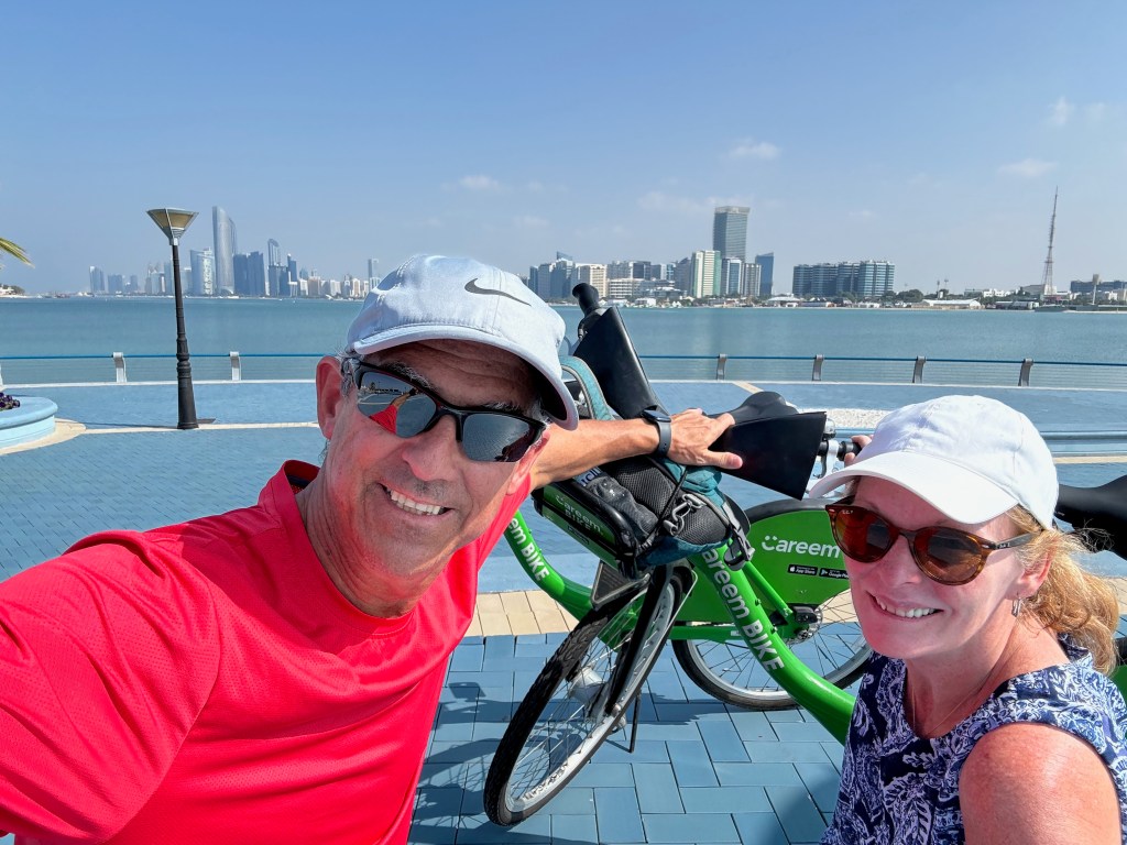We had three days to explore Abu Dhabi. Our first day we biked the Abu Dhabi’s Corniche which stretches across an impressive eight kilometres of manicured waterfront boasting children’s play areas, separate cycle and pedestrian pathways, cafés and the stunning Corniche Beach. We stopped for a quick walk along the beach and then continued on to Heritage Village. This village is an immersive experience in the traditional way of life in the desert as well as offering a glimpse at Abu Dhabi’s past through an old-world souk, mosque and pearling boat display. From here we biked past the Emirates Palace Hotel and the entrance to the Presidential Palace but did not go into either. One interesting thing I learned was that pearl diving was a key industry prior to the discovery of oil reserves. Pearl divers dive for one to three minutes and would have dived as many as thirty times per day. Air tanks and any other sort of mechanical device was forbidden. The divers had a leather nose clip and leather coverings on their fingers and big toes to protect them while they searched for oysters. The divers were not paid for a day’s work but received a portion of the season’s earnings.