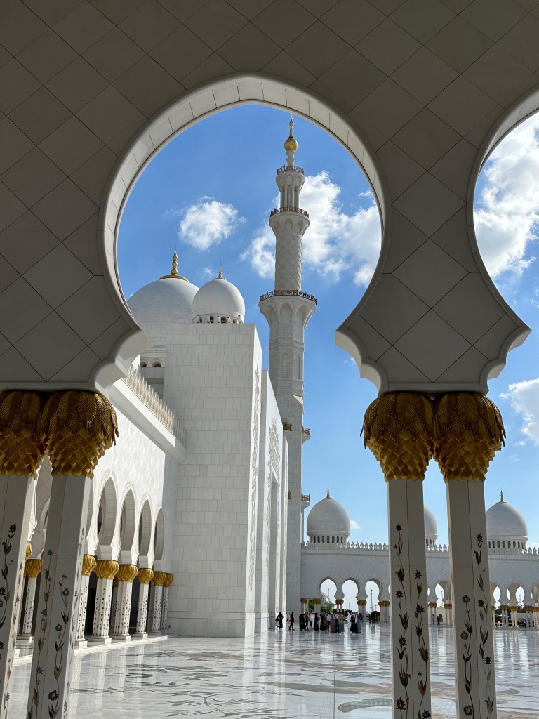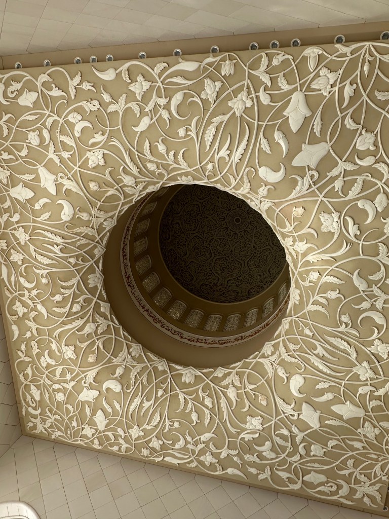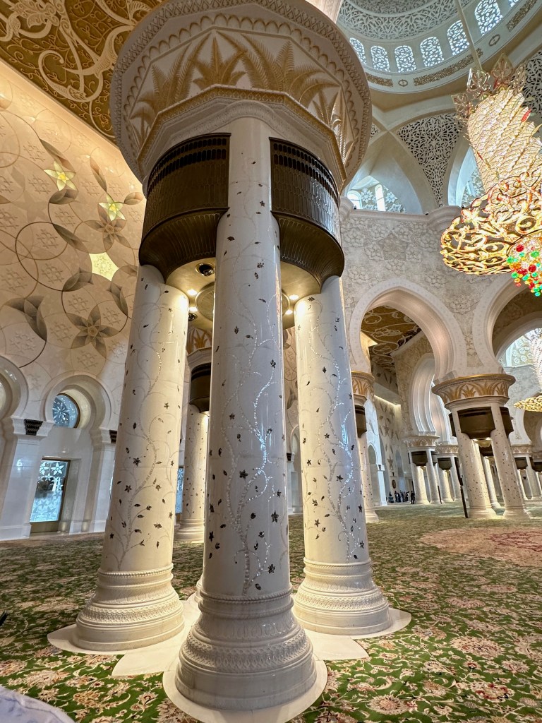 Thousands of columns, 1096 external ones around the outside arcade all made of white marble panels inlaid with precious and semi-precious stones with a design inspired from the date palm – a tree valued throughout Arabia – as well as the 96 internal columns arranged in groups of four, to provide structural support for the three main domes in the main prayer hall clad with white pure marble inlaid with mother-of-pearl vines.